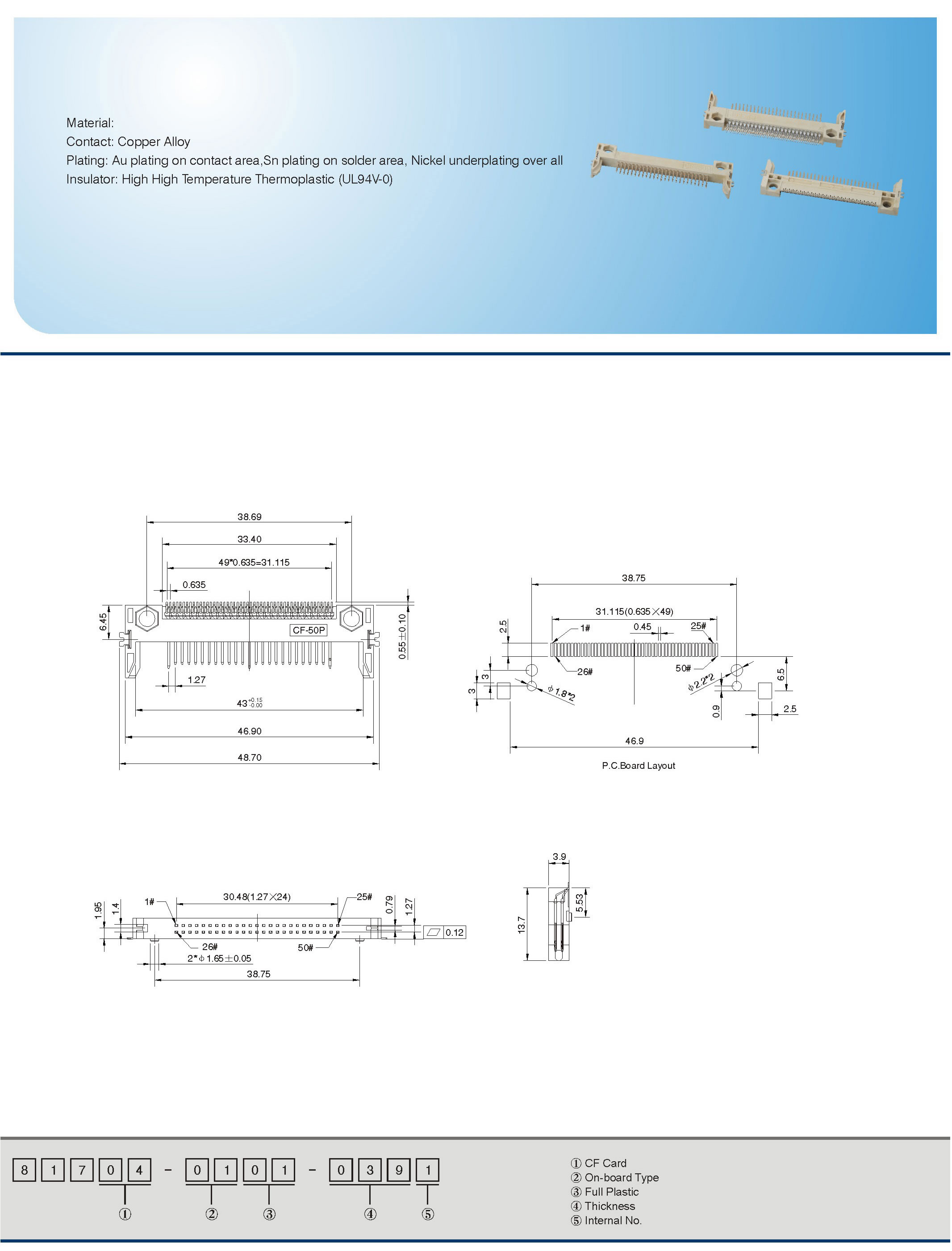 Plating: Au plating on contact area,Sn plating on solder area, Nickel underplating over all