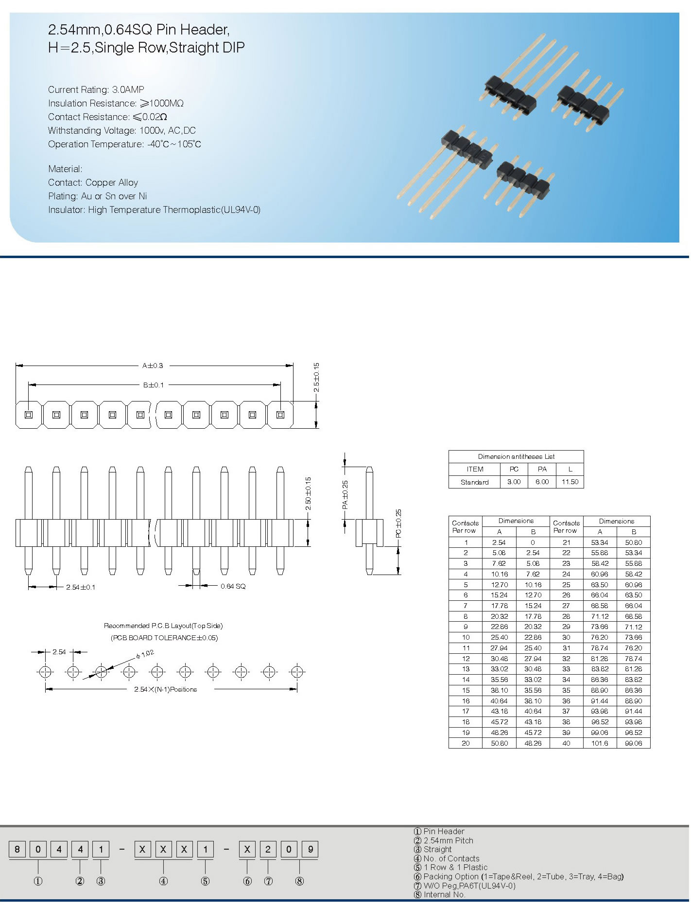 2.54mm,0.64SQ Pin Header,