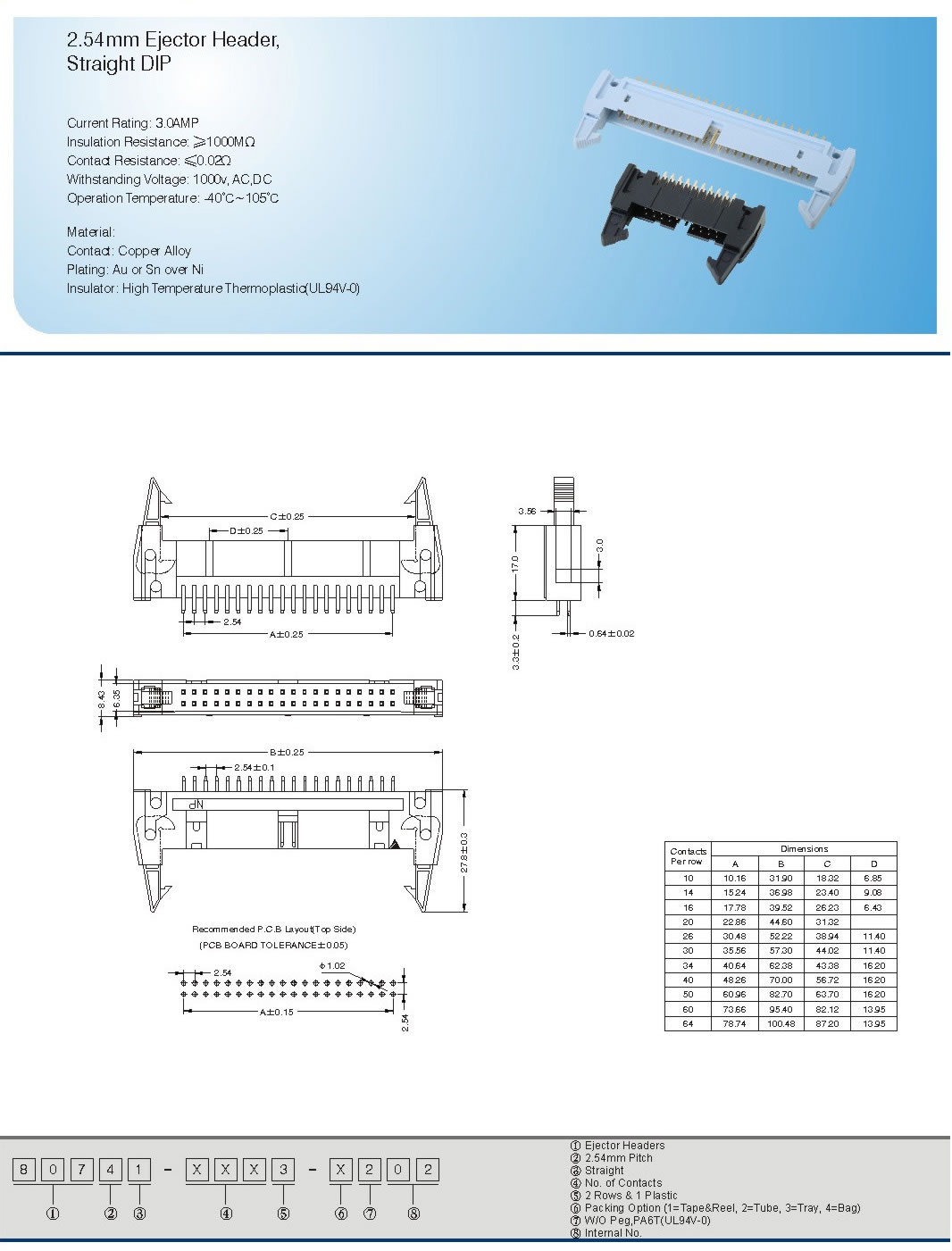 2.54mm Ejector Header,Straight DIP